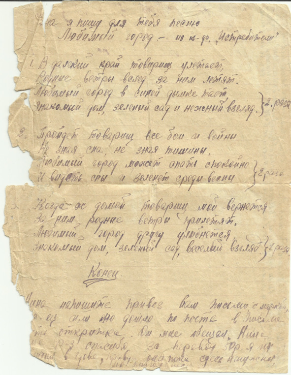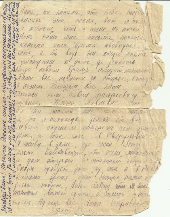 Нина, ты писала, что тебе понравилась эта песня, вот я тебе и написал, хоть и поздно, но ничего. Нина, пиши мне письма почаще, конечно, если время свободное есть, а то ведь ты скоро опять приступишь к учёбе да работе, тогда совсем время не будет на письма. Пиши все новости и старое, которое я не знаю. В общем, всё пиши. Скажи Гале, Павлу Григорьевичу, Кларе Павловне (К.П. – это я, мне 10 лет, он помнит наши игры!), чтобы и они мне письма чаще писали, а то я нахожусь далеко от вас; интересно, что делается дома, а также в Свердловске. Очень скучаю. Я живу в доме, где жил Петр Ильич Чайковский, это очень любопытно, и дом старый… Скоро пройдёт уже год, как я в РККА… Нина, извини, что я написал всякой ерунды. Ну пока. Пиши. С приветом. Брат Валя.»