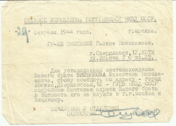 Почтовый адрес: г. Ленинград, п/о 302, п/я 115, дом №8, кв.32 Вишнякову В. Н. по этому адресу мы писали ему письма до выезда на фронт.