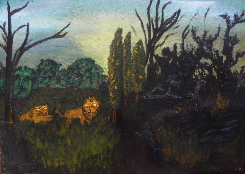 Из темноты пытаясь найти выход, я попадаю на то место, где стоит дуб. Иду в полусумрак по тропинке, вдоль которой стройные высокие деревья. И шаг мой быстрый начинает зависать, как в воду попал. Движения увязли. За деревьями луг, и там две фигуры: лев с пышной гривой и львица. В их глазах я вижу океаны. Лев посмотрел мне в глаза и молча остановил меня. А львица сказала мне, так же не открывая рта: