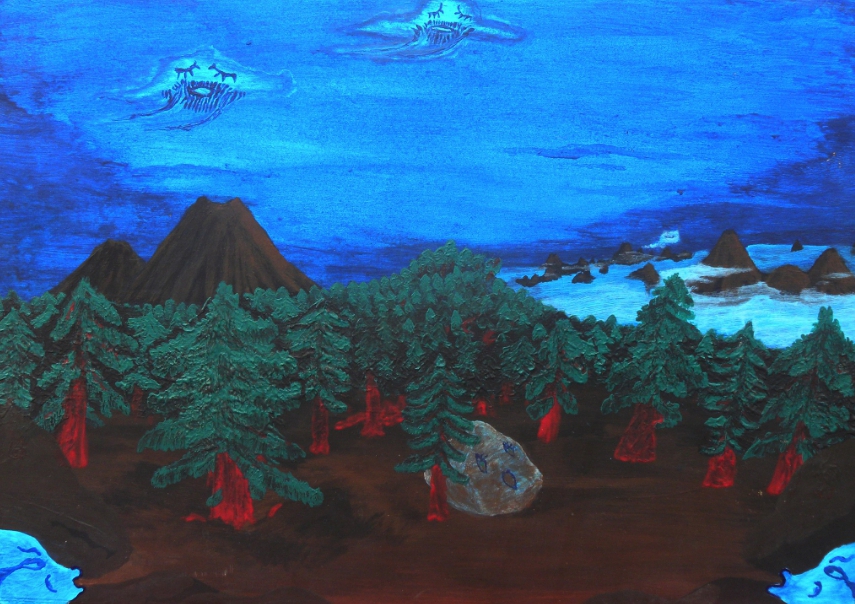 Все было как там, в предыдущих видениях: голубые озера с дивными рыбинами, личины всюду, каждый со своими историями. Все живо, все трепещет, все живое по отношению друг к другу. И величайшее блаженство внутри. Какие-то большие страшноватые фигуры с длинными конечностями в темноте леса виднеются. Но я точно уверен, что они мирны. А надо мной в небесах из облаков – фигура от горизонта до горизонта существа, напоминающего мощного юношу стремящегося, стихия, обличенная в виде человека. А глаза у него ярко-желтого цвета с черными прожилками. Как два глубоких костра, обозревающих поверхность медленно тянется он . Из леса то и дело слышны перепевы. Кого? Не знаю. Звучные, глубокие переклички: «уа-а-а-ау-у-у», «уаи-и-и-и-и», «ео-о-о-о-о-о-о-о», «ыо-о-ое-е-е».