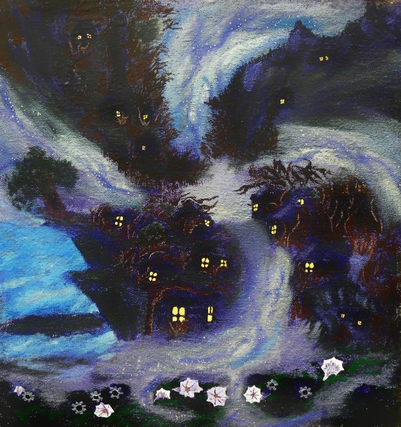 Перед нами высились горы, и, поднимаясь, мы увидели усыпанные по ним горящие окна домов, множеством своим уходящих ввысь, и где кончались окна домов, а где начинались звезды, было не разобрать. И от окон этих исходило радушие, от каждого слышно было беззвучно: «Рады тебе, откуда ты, путник?» Тропы вились там так разнообразно – вверх, вниз, вправо, влево и в еще одну сторону,которую на земле не увидеть – что глаза разбегаться стали. Помимо этого, там еще были ходы в пещеры внутрь гор, из которых тоже светились очаги. Над головами всюду сходились извилистые ветви. Мы блуждали, все было волшебно, все было интересно. Попутчик мой свернул, а я один вышел на скалистый уступ. Там в свете луны грохотали бушующие волны океана, волны дыбились и пеной своей поливали высокий уступ.