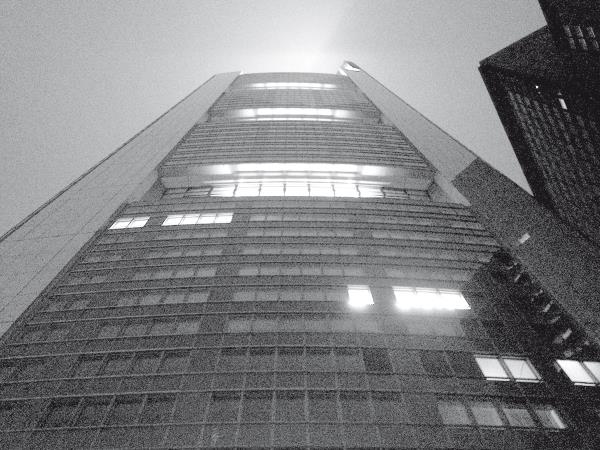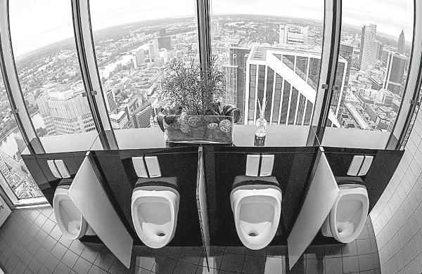 Но внутри у Коммерцбанк-Тауэр есть секрет: мужской туалет с рядом керамических писсуаров, расположенных так, что когда ими пользуешься, перед тобой открывается панорамный вид на город, на снующих по своим делам людей.