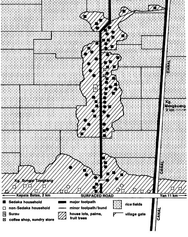 Sedaka household – домохозяйства Седаки, non-Sedaka household – домохозяйства за пределами Седаки, Surau – сурау (молитвенный дом), coffee shop, sundry store – кофейня, магазин товаров первой необходимости, major footpath – основная пешеходная дорога, minor footpath/bund – мелкие проходы/насыпи, house lots, palms, fruit trees – участки с жилой застройкой, пальмы, фруктовые деревья, rice fields – рисовые поля, village gate – ворота на въезде в деревню.