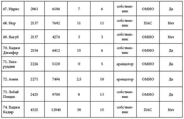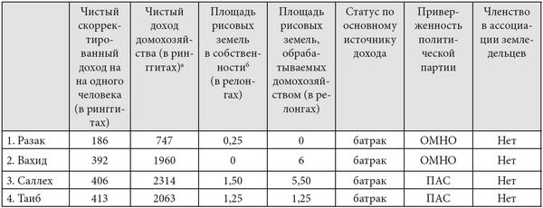 в) В трех случаях политическая приверженность обозначена малайским словом пагар, означающим ограду. Это означает, что глава домохозяйства не связан ни с одной из партий (либо с обеими сразу), а в одном случае симпатии супругов принадлежали разным партиям. Партийные пристрастия, как правило, известны всем жителям деревни, а независимые оценки политической приверженности практически полностью совпадают с мнением селян.
