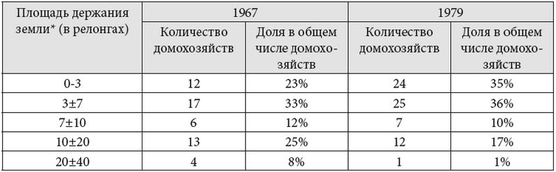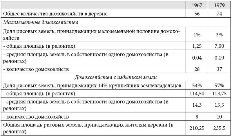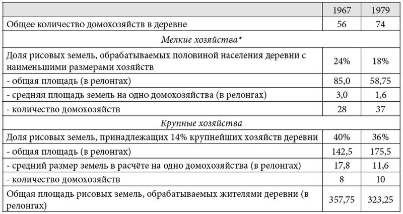 Наиболее очевидной тенденцией последнего десятка лет стало увеличение как количества, так и доли хозяйств небольшого размера при снижении доли крупных хозяйств. Количество хозяйств, обрабатывающих земли площадью в три релонга и менее, удвоилось – с 12 в 1967 году до 24 в 1979 году. Пять из них имеют менее одного релонга земли – Хории в своём исследовании 1967 года мог вполне обоснованно игнорировать этот типоразмер хозяйств. За тот же период средняя площадь этих микроскопических хозяйств сократилась до менее чем двух релонгов, или 1,4 акра [0,57 гектара]. Сокращение размеров мелких хозяйств не является следствием стабильного состава класса мелких землевладельцев, которые вынуждены обрабатывать всё меньше и меньше земли, – напротив, доля земли в держании селян, на которой работают такие мелкие пользователи, выросла почти в два раза, с 7 % до 13 %. Утрата их позиций как класса произошла отчасти потому, что таких земледельцев стало намного больше, а отчасти в силу того, что общая площадь рисовых земель, обрабатываемых сельскими жителями, сократилась почти на 10 % (с 357,75 релонга до 325 релонгов).