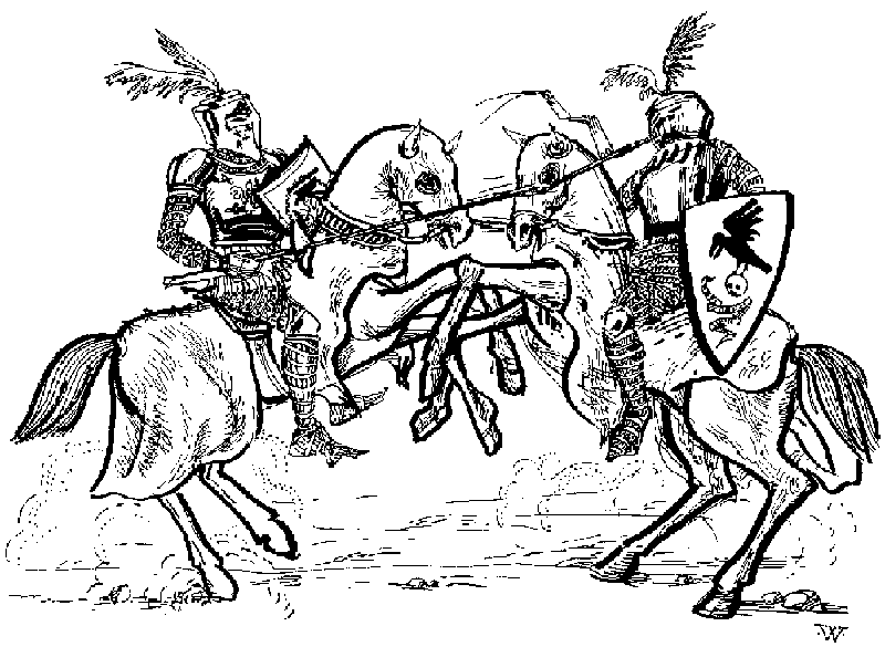 The two champions stood opposite each other at the two ends of the lists. The trumpets gave the signal and the champions vanished from their posts with the speed of lightning, and clashed in the centre of the lists with the sound of thunderbolt. The lances burst into pieces, and it seemed for a moment that both knights would fall. However they managed their horses and returned to their positions, where each received a fresh lance from his squire.