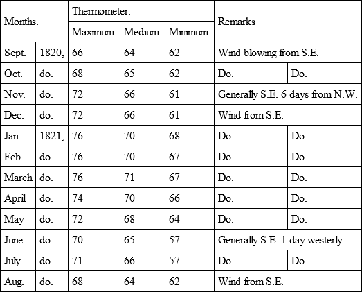 (Signed) "Robert Gambier,"Captain of H. M. Ship Myrmidon."No. III[See p. 249.]States of Thermometer, as taken at Deadwood, island of St. Helena, during twelve calendar months, viz. from 1st Sept. 1820, to 31st Aug. 1821, inclusive. – This condensed view of the different states of the Thermometer was kept at Deadwood, which is just one short mile from Longwood, and therefore expresses the exact temperature of the climate in which he lived – milder, and more equable, certainly, than most in the known world. In point of moisture, Dr. Shortt is not of opinion that St. Helena differs materially from any other tropical island of the same extent. His account of the general state of health among the troops has been already referred to.