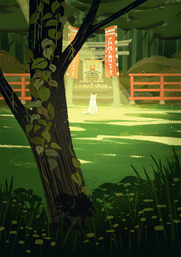 Следуя за белым котом по заросшим травой дорогам и тропинкам, утопающим в зелени, ты оказываешься в лесу, в самом центре острова. Небо неподвижно, свет мягко просвечивает сквозь листву. Ты замечаешь, как белый хвост исчезает за кустом, и среди листвы мелькает что-то красное. Это небольшое святилище, возведенное в честь кошки, погибшей от удара каменным грузилом, из тех, что вешают на рыболовные сети: человек, по неосторожности убивший ее, очень расстроился и захотел отдать дань уважения животному и успокоить его дух.