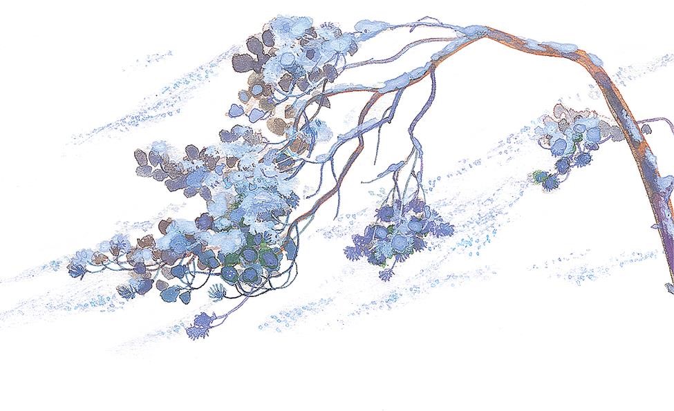 И на рябинку, что у самой опушки растёт, белое покрывало накинула. Так хорошо получилось! На концах ветвей у рябины грозди ягод висят, точно красные серьги из-под белого покрывала виднеются.