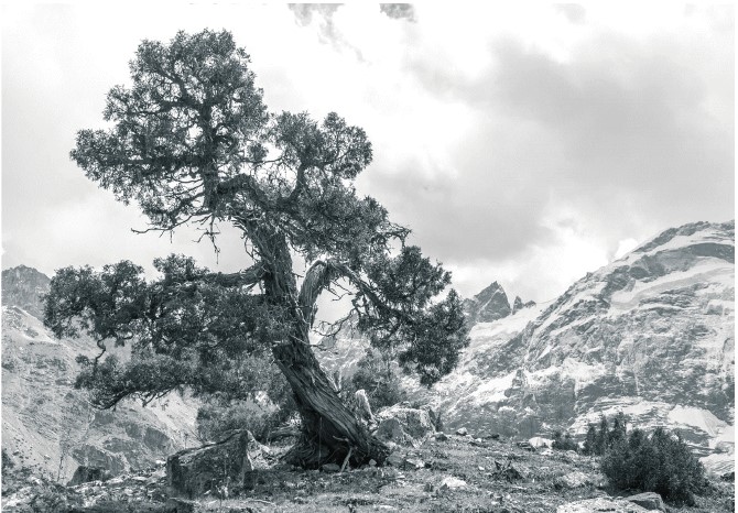 Подойдя к позиции пулемётчика, на которой ещё был оборудован наблюдательный пост, остановились рядом с вечнозелёным деревом, арчой. Этот хвойный древовидный можжевельник из семейства кипарисовых был с уродливо-извилистым стволом, его корни уходили в каменистую почву. Часть корней свисала вниз и своими концами впивались в нижние камни обрыва, всасывая влагу для питания. Такие же редкие хвойные арчовые деревья, которые солдаты прозвали высокогорными ёлочками, были разбросаны на соседних горах среди осыпей в скалах. Ниже были видны поросли кустарников ольхи, акации и барбариса.