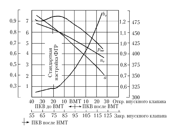 Специалисты-инженеры отмечают, что найденные для определенной частоты вращения KB наиболее эффективные фазы газораспределения при другой частоте вращения таковыми уже не являются, так как не обеспечивают соответствующего наполнения цилиндров. Поэтому в подавляющем большинстве случаев фактически производится регулировка момента начала открытия клапанов для наиболее характерного в процессе эксплуатации скоростного режима работы двигателя. Общей тенденцией для впускных и выпускных клапанов, имеющей место с ростом частоты вращения KB, является более раннее начало и увеличение продолжительности их открытия по углу ПКВ.