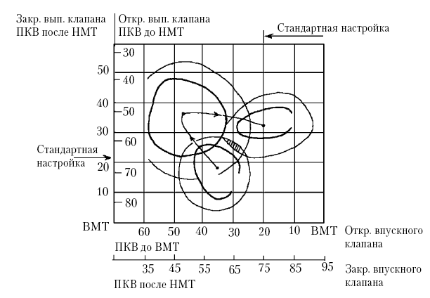 Поэтому для обобщения результатов строится диаграмма, у которой по оси абсцисс откладываются значения фн.о. вп, а по оси ординат – значения фн.о. вып. На эту диаграмму наносятся максимальные значения pme при минимальной, средней и номинальной частоте вращения KB. Затем вокруг этих значений строятся, например, линии (pme – 2 %pme max) = const. Если область, в которой линии всех максимумов пересекаются, отсутствует, то строят (pme – 4 % pme max) = const. В результате таких построений определяется область значений углов начала открытия клапанов (на диаграмме эта область заштрихована), в которой на каждом скоростном режиме обеспечивается 96 % pme Для получения желаемого результата остается выставить на двигателе такие значения фн.о. вп и фн.о. вып, чтобы соответствующие этим значениям линии пересекались на диаграмме в заштрихованной области (рисунок 2).