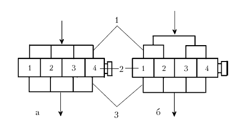 Рис. 4. Схема впускного коллектора: а – с пространственной симметрией; б – с пространственно-временной симметрией: 1 – впускной коллектор; 2 – блок цилиндров двигателя; 3 – выпускной коллектор