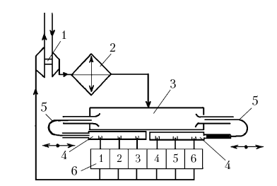 Рис. 5. Схема системы впуска одноблочного дизельного двигателя с волновым наддувом: 1 – турбокомпрессор; 2 – холодильник наддувочного воздуха; 3 – ресивер; 4 – резонатор; 5 – телескопическое колено волнового трубопровода; 6 – блок цилиндров двигателя