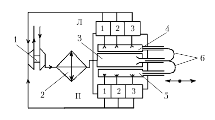 Рис. 6. Схема системы впуска двухблочного дизельного двигателя с волновым наддувом: 1 – турбокомпрессор; 2 – холодильник наддувочного воздуха; 3 – ресивер; 4 – резонатор левого (Л) блока цилиндров; 5 – резонатор правого (П) блока цилиндров; 6 – телескопические колена волновых трубопроводов