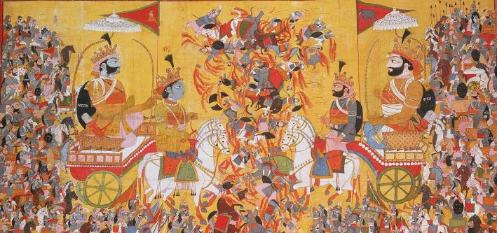 Авторство поэмы приписывается легендарному мудрецу Кришне-Двайпаяне Вьясе (на санскрите его имя означает “тот, кто упорядочивает”). Сюжет “Махабхараты” – история рождения, воспитания и непримиримой вражды двух ветвей царского рода Бхаратов: Кауравов, 100 сыновей царя Дхритараштры, и пяти их двоюродных братьев Пандавов (сыновей царя Панду). Кауравы воплощают в эпосе темное начало, Пандавы – светлое, божественное. Основная нить сюжета – это соперничество двоюродных братьев Арджуны и Карны за царство и столицу (город Хастинапуру).