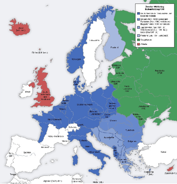 Карта Европы к 1 июня 1941 г. Синим Германия, и ее союзники (не помечена французская территория Виши), красным Великобритания, зеленым СССР
