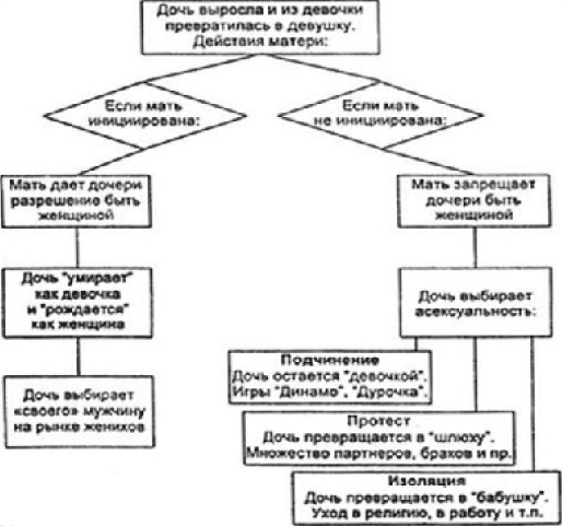 Однако, как подчеркивают Ефимкина и Горлова, если же мать – инициированная женщина, то она не скрывает от дочери тему секса, и тем самым дает ей разрешение на то, чтобы та стала женщиной. Мать не только помогает дочери пройти соответствующую инициацию, но и сама является образцом для подражания.