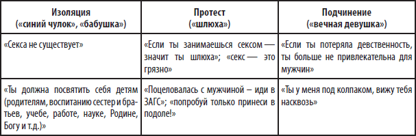 Одно из самых распространенных детских воспоминаний наших клиенток состоит в том, что в возрасте 13–14 лет, когда клиентка стала девушкой, мать запретила ей встречаться с мальчиками. Поскольку в реальной жизни суть отношений была скрыта, а именно слиты в одну две роли матери (мать и соперница), то скрыты были и манипуляции, запрещающие девушке жить как женщине. Чаще всего клиентки вспоминают, что мать демонстрировала заботу, говоря: «Не пойдешь гулять, пока не сделаешь все уроки». Скрытые же послания гласили: «Боюсь, что ты встретишься с мальчиками и вступишь в сексуальные отношения», «Боюсь потерять власть над тобой, если ты станешь сильной». «Ты моложе и красивее меня, если ты вступишь в возраст сексуальности, мне придется уступить тебе свою власть». Но поскольку тема секса в семье табуировалась, то девушка запрещала себе понимание истинных мотивов своей матери.