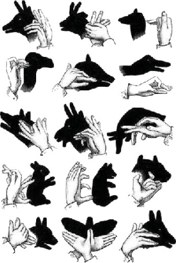 Игра «Театр теней». Взрослый (чаще родитель) показывает ребенку «театр теней» – изображение различных животных в виде тени на стене (рис. 2). Ребенок должен угадать, какое животное показывают.
