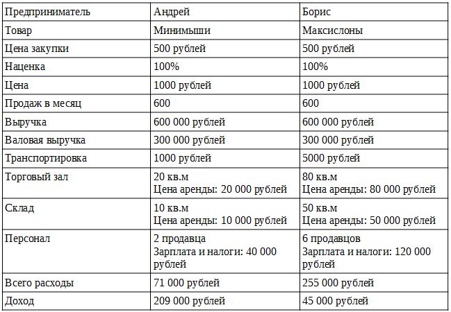 Рассмотрим на примере: Андрей торгует Минимышами, а Борис Максислонами. Закупочная цена товара одинаковая. Наценка тоже. В месяц продается одинаковое количество товара. Закупочная цена 500 рублей, розничная цена 1000 рублей, в месяц продается по 600 штук товара. Ситуация выглядит одинаковой, но Минимыши в 4 раза меньше, чем Максислоны. Посчитаем затраты предпринимателей:
