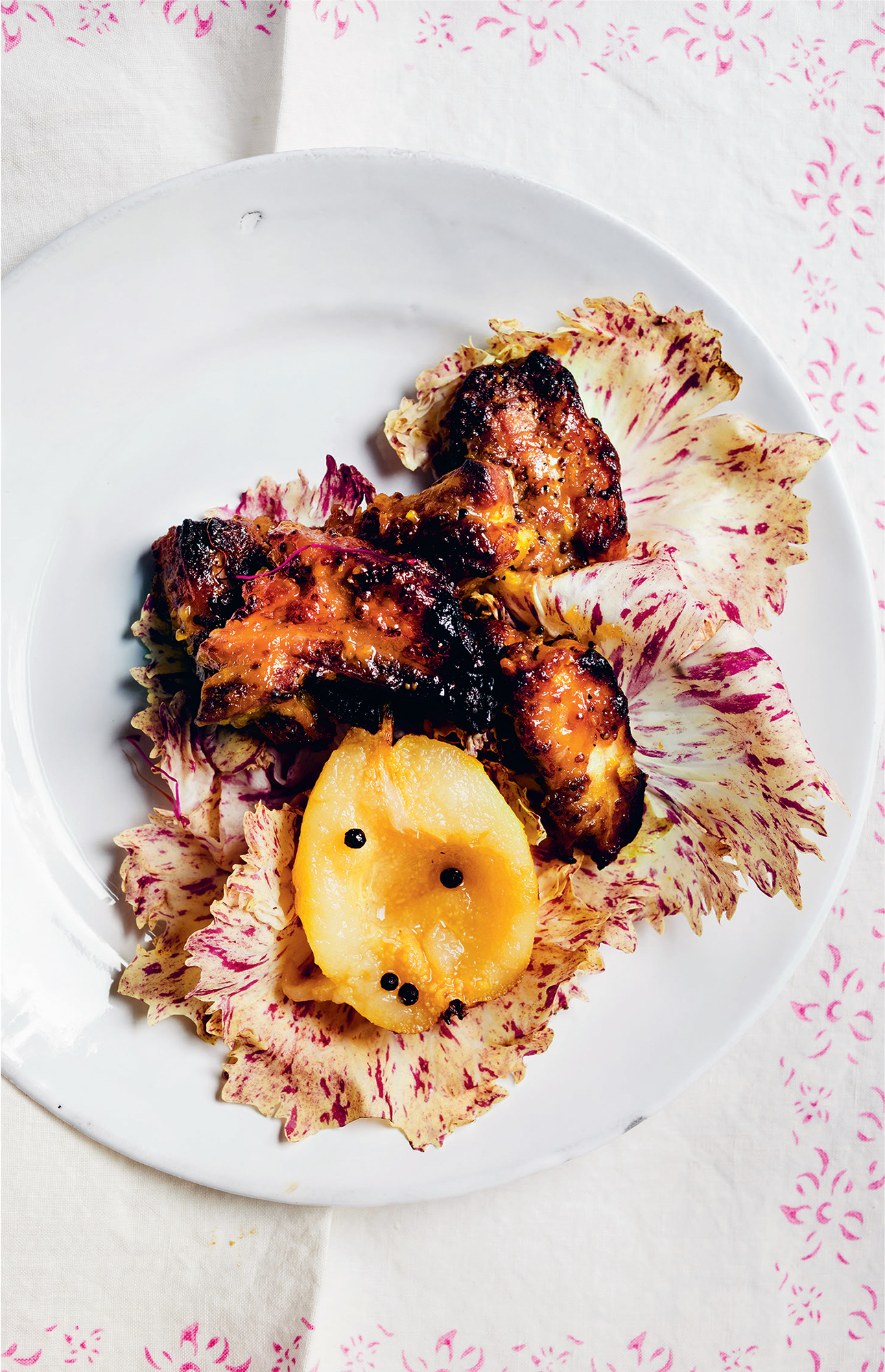 Tear the pork into short, finger-width strips, then toss with the hot dressing. Return the dressed meat to the oven for seven to ten minutes, until the surface is sizzling and starting to caramelise. Wash and dry the salad leaves and place them on a serving plate, then pile the pieces of hot pork on top. Place half a pickled pear on each plate.