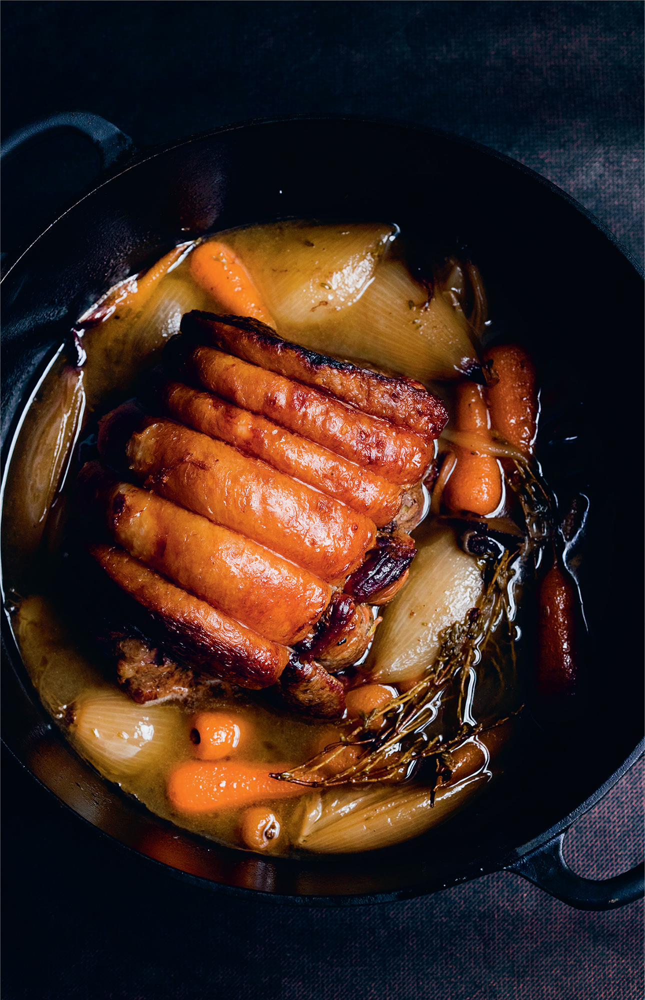 Place the rolled and tied brisket in a large casserole, then put it into the oven and roast for twenty-five minutes. Peel and trim the shallots and halve them lengthways. Scrub the carrots and halve them lengthways. Add them both to the casserole together with the porcini and their broth, the peppercorns, bay leaves and thyme, then cover with a lid. Lower the heat to 160°C/Gas 3 and bake for four hours.