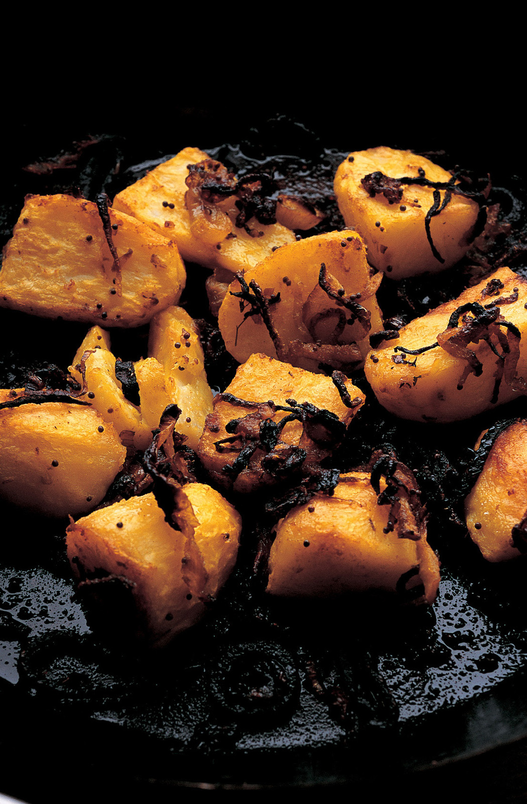 Peel the onions and slice them finely. Heat enough oil in a roasting tin to make a thin film over the bottom. The thicker the base, the less likelihood there is of the spices burning. As the oil warms, add the sliced onions and let them soften, then stir in the chopped chillies, garlic and cumin and let them warm through, stirring (and watching like a hawk) so that they do not burn. Add the potatoes to the hot oil, add the turmeric, then slowly stir and toss the potatoes so that they are covered with the seasoned oil.