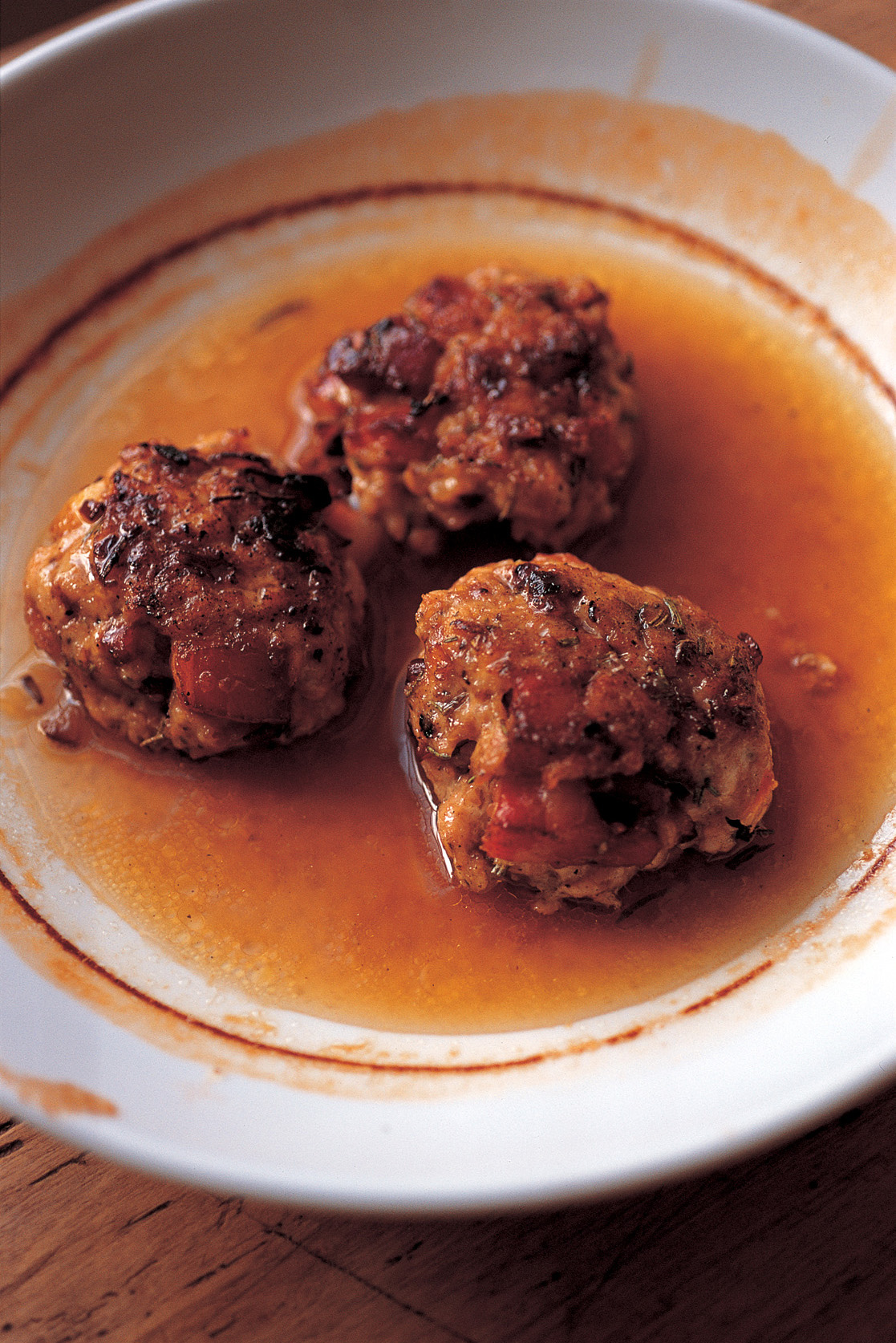 Wipe the onion pan clean and get it hot. Add a little groundnut oil and brown the patties on both sides – that’s a matter of three minutes per side – then transfer them to an ovenproof dish. Pour in the stock and bake for twenty-five to thirty minutes, till the patties are sizzling and the stock is bubbling. Serve two to three per person and spoon over some of the hot chicken stock.