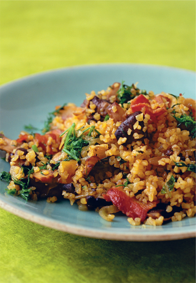I sometimes spoon a little seasoned yogurt – salt, pepper, paprika – over this at the table, stirring it into the grains. But mostly I leave the pilaf as it is, enjoying the warm, homely grains and juicy nuggets of mushroom as they are.