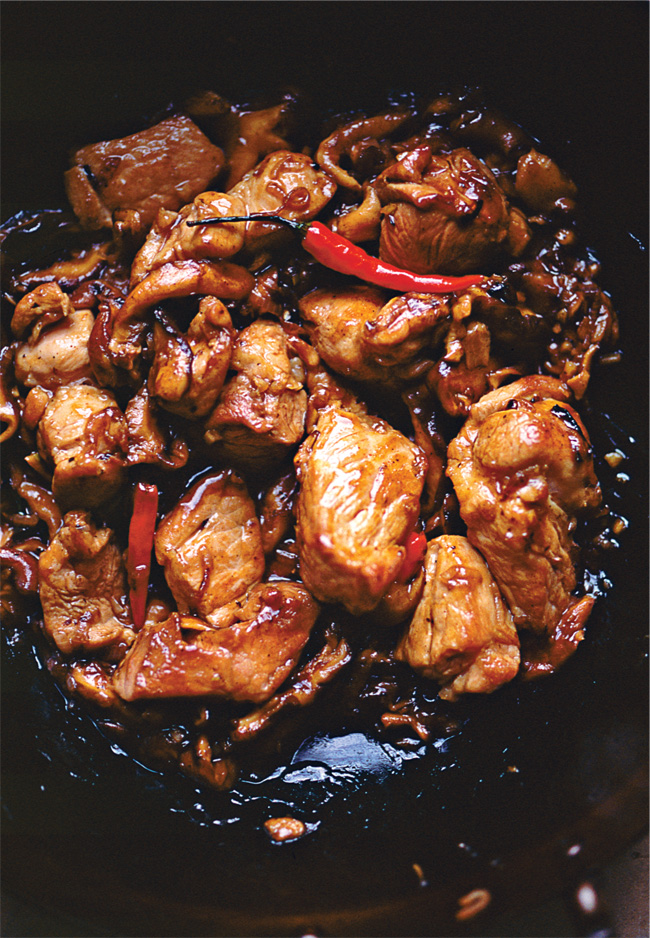 Meanwhile, peel and finely chop the garlic and peel and slice the shallots. Finely chop, but do not seed, two of the chillies. Leave a couple whole to add a deeper, subtler flavour. Get the wok hot, pour in the remaining oil and let it start to smoke, then add the chopped garlic, shallots and chillies, stirring as they cook. Fry them for a minute or two till they start to colour. Add the mushrooms, whole or torn up if they are large. Continue stir-frying till they are soft and lightly coloured, then return the meat to the pan. Once the meat is thoroughly hot, stir in the oyster sauce and the wine and bring to the boil. Let the resulting sauce reduce for a minute, maybe two, then serve.
