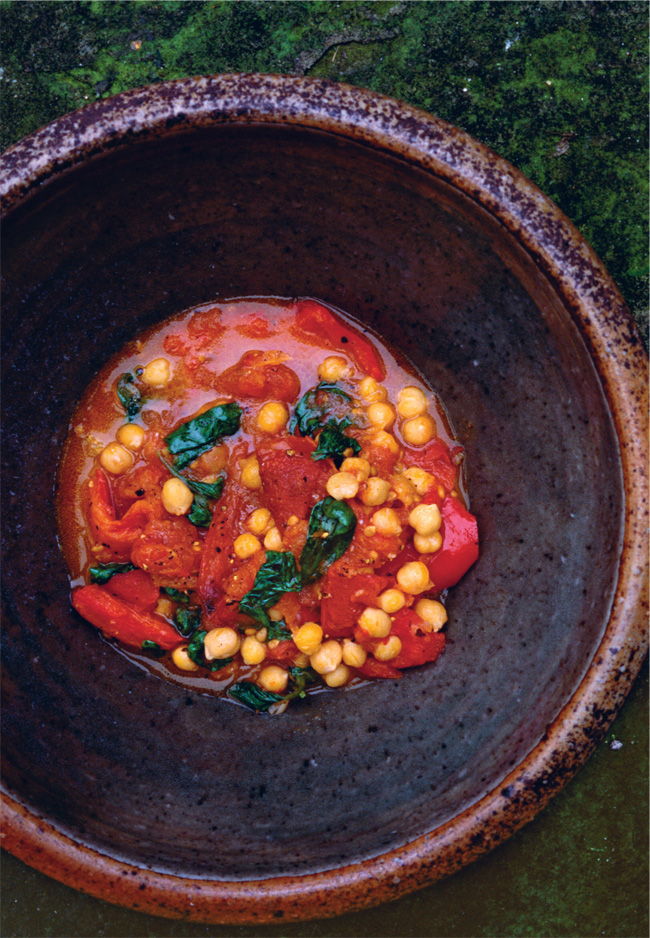 Transfer the tomatoes and peppers from the baking dish to a saucepan. Drain the chickpeas of their canning liquor and rinse them under the cold tap. Mix the drained chickpeas with the tomatoes and peppers.