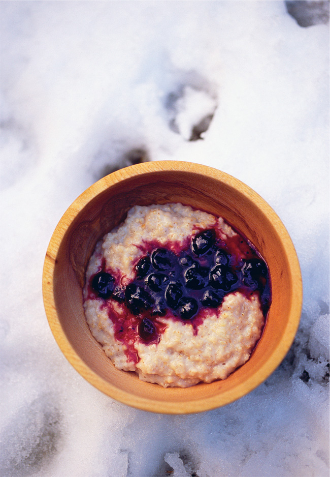 The recipe is straightforward, and I owe it entirely to Ian. I bring three cups of water to the boil, pour in a cup of medium pinhead oatmeal in a steady flow (let it fall in a steady rain, is how Marian McNeill puts it in The Scots Kitchen), stirring all the time in a clockwise direction. It is done in five minutes, no longer, a scant teaspoon of salt added in the last minute of cooking. As it slides into the wooden porridge bowls, I spoon in a smudge of damson or blackcurrant jam and, if there is any around, some cold single or double cream, avoiding the temptation to write my initials with maple syrup. Tradition prefers us to stand. I hope that leaning against the kitchen sink isn’t going to induce the wrath of the devil.