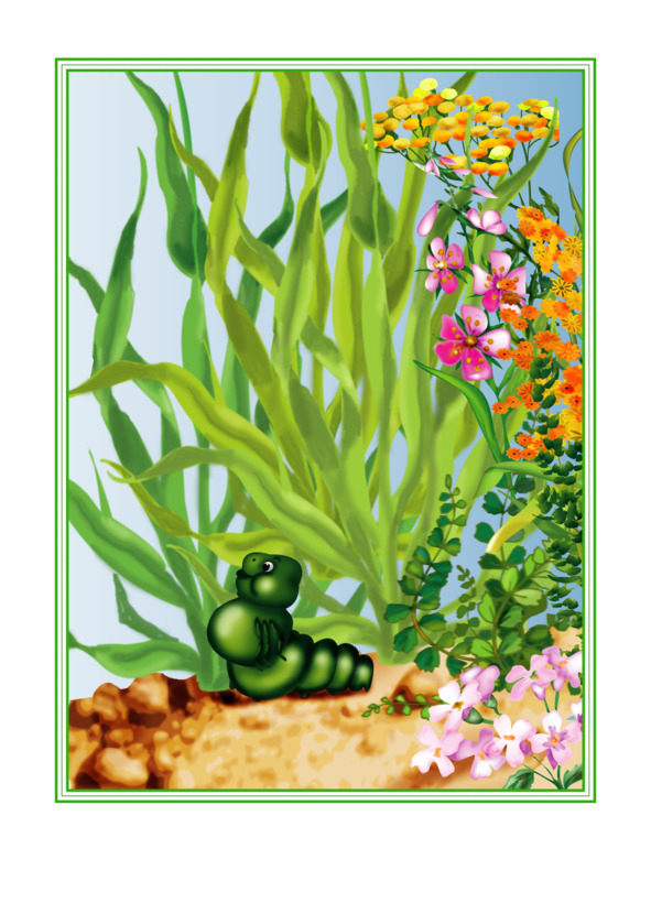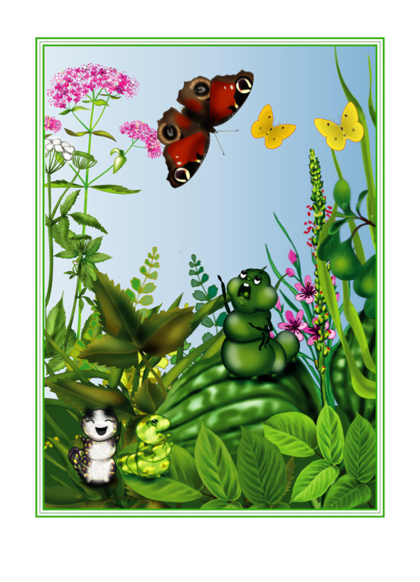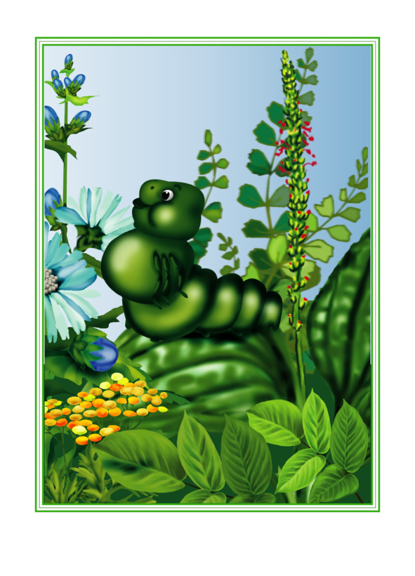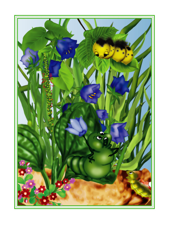– Ах, какая же я красавица! – радовалась гусеница. – Какая у меня гладкая зеленая кожа, какие большие черные глаза, какие крохотные изящные ножки!