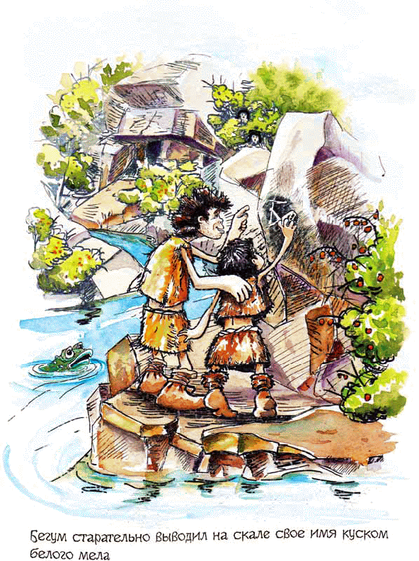 Стоя на берегу Быстрой Реки неподалеку от Скрытой Пещеры, Бегум старательно выводил на скале свое имя куском белого мела. Если буква не получалась, он мочил в прозрачной воде лист первобытного лопуха, все стирал и принимался писать заново.