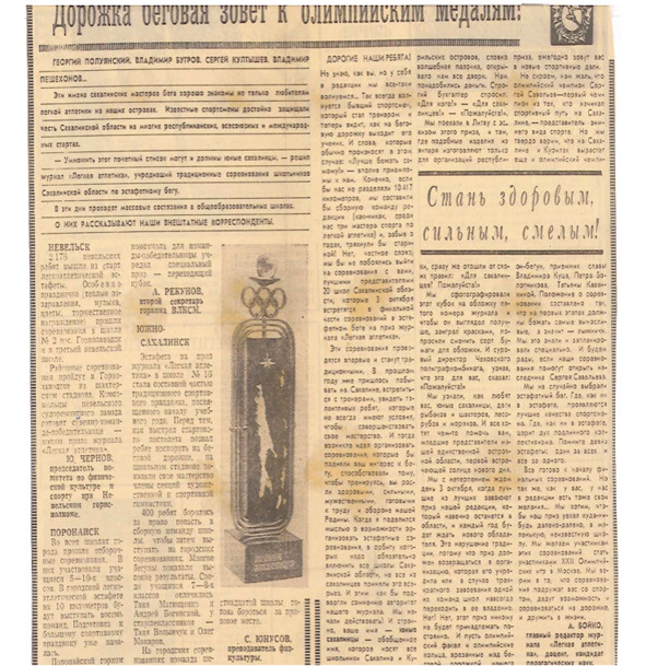 И здесь благодаря инициативе, друзьям и хорошим нашим взаимоотношением со спортивным руководством в Москве мы договорились с редактором всесоюзного журнала «Легкая атлетика» Бойко об учреждении специального приза для сахалинских школьников. Поэтому нам пришлось потрудиться, чтобы эти первые соревнования прошли на высоком уровне.