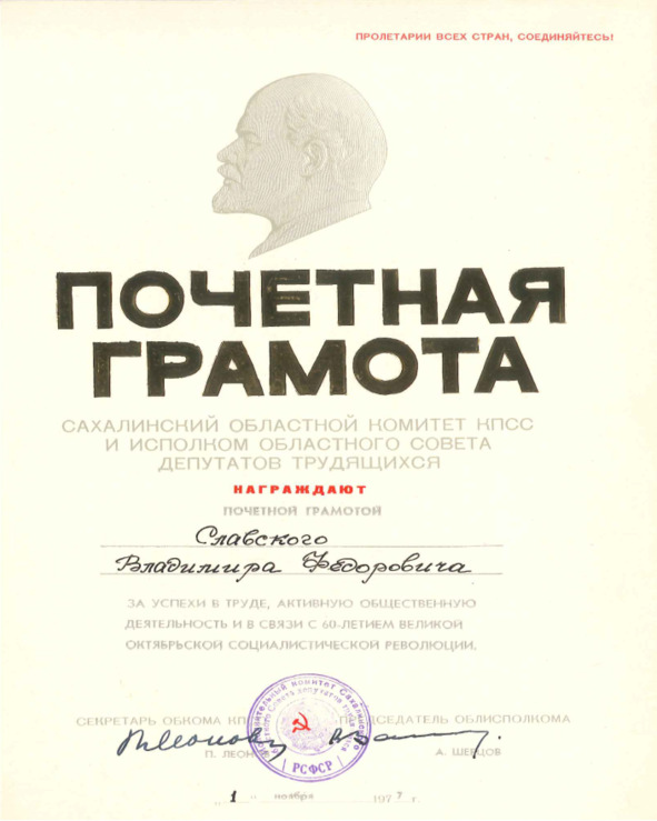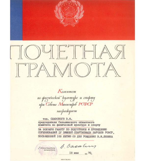 Вот результаты только одного года. Областная федерация пропаганды физической культуры и спорта и облспорткомитет совместно с журналистами, работниками спортобществ и ведомств определили десятку лучших спортсменов области 1977 года: Анатолий Козлов – чемпион СССР, Европы и мира, рекордсмен мира по тяжелой атлетике, мастер спорта СССР международного класса, ДСО «Водник», Холмск. Валентина Тропак – дважды чемпионка РСФСР в лыжных гонках на 10 и 20 км, бронзовый призер чемпионата СССР в эстафете, мастер спорта международного класса, спортивное общество «Динамо», Южно-Сахалинск. Сергей Култышев – победитель международных соревнований на приз газеты «Правда» в беге на 5000 м, мастер спорта СССР, ДСО «Спартак», Южно-Сахалинск. Анна Ермакова – бронзовый призер первенства РСФСР в лыжной гонке на 10 км, бронзовый призер чемпионата СССР в эстафете, 9-е место на чемпионате СССР в гонке на 5 км, мастер спорта СССР, спортивное общество «Динамо», Южно-Сахалинск. Алевтина Спиридонова – 6-е место в гонке на 30 км на чемпионате СССР, мастер спорта СССР, спортивное общество «Динамо», Южно-Сахалинск. Ольга Кузилина – чемпионка СССР среди старших девушек в скоростном спуске, мастер спорта СССР, ДСО «Спартак», Южно-Сахалинск. Владимир Пешехонов – серебряный призер первенства РСФСР по легкоатлетическому кроссу, 2-е место в марафонском пробеге на приз газеты «Труд», мастер спорта СССР, ДСО «Спартак», Южно-Сахалинск. Андрей Поляков – чемпион ВЦСПС по биатлону среди старших юношей, бронзовый призер СССР в эстафете, перворазрядник, ДСО «Спартак», Южно-Сахалинск. Галина Павлова – бронзовый призер первенства РСФСР по плаванию среди девушек, мастер спорта СССР, ДСО «Спартак», Южно-Сахалинск. Алексей Маргулис – чемпион летнего первенства СССР по прыжкам на лыжах с трамплина среди старших юношей, перворазрядник, ДСО «Спартак», Южно-Сахалинск.