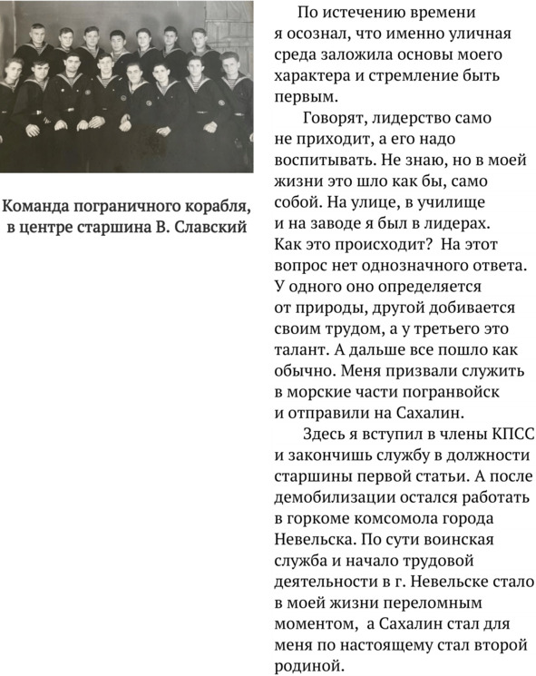 А затем призыв в Армию. Служил я на пограничном корабле и дослужился до старшины первой статьи. В 1961 году, сразу после демобилизации, с одним бушлатом в руках пришел я в горком комсомола города Невельска сахалинской области. Там и продолжилась моя трудовая деятельность. Конечно, это был мой выбор, но, видно, так угодно было судьбе. Здесь я женился, завел семью и всем сердцем полюбил этот край. Когда говоришь о судьбе, невольно приходит в голову мысль: а что это такое – судьба? Наверное, на этот вопрос можно ответить только после многих лет жизни, да и то неоднозначно. Мне кажется, что судьба очень любит принимать решения в одиночку. Не хочется верить в потусторонние силы, но зачастую обстоятельства складываются таким образом, что начинаешь верить в истину – «все, что ни делается, – к лучшему». И это подтверждается жизнью. Так случилось и со мной. Я не выбирал себе дороги. А шел по-обычному тогда жизненному пути и везде работал добросовестно. Наверное, это была и есть моя судьба. Я только к этому добавлю: «На Бога надейся, но и сам не плошай». Это все, вместе взятое, и определило мои дальнейшие поступки и мировоззрение.