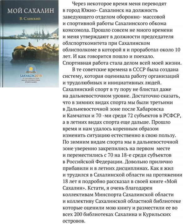 Спортивные дела и успехи в спортивных делах сахалинцев были замечены на всесоюзном уровне. B подтверждение вышесказанного предлагаю Вашему вниманию абзац из выступления на всероссийском собрании спортивных работников Российских Федерации (апрель 1976 года) Председателя Госкомспорта CCCР С. Павлова «Отметив определенные успехи спортивной России, передовых ее организаций таких как Ставропольский край, Сахалинской и Свердловской областей Павлов обратил внимание на то что в целом в республике физическая культура и спорт развиваются недостаточно высокими темпами». Приятно было получить подобную оценку на всесоюзном уровне, которой я и сейчас горжусь. Особенно сахалинцы и обспорткомитет проявили себя при подготовке к зимним олимпийским играм в Саппоро. В городе Южно-Сахалинске была построена уникальная спортивная база для лыжных видов спорта на которой сборные команды СССР вели подготовку к Олимпиаде. Более подробно как я уже сказал об этом и других важных этапах я рассказал в своей книге, но период подготовки к олимпиаде был отмечен в вышестоящих инстанциях и особенно деятельность коллектива сахалинского облспорткомитета и мою лично. И вот на этом фоне мне и было предложено несколько престижных должностей в Москве и Московской области. В итоге мне было доверено одно из самых престижных направлений в советском спорте – должность начальника управления зимних видов спорта в Госкомспорте РСФСР.