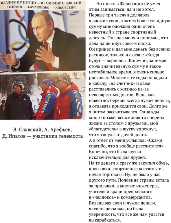 За восемнадцать лет существования Федерации мы получили финансовую помощь: – от Олимпийского комитета России в размере тридцати тысяч долларов, – от Ассоциации олимпийских зимних видов спорта пятьдесят тысяч долларов. И все! Я же экономил, на чем только возможно: секретаря в штате не было, машину использовал личную, я не стремился к роскоши и не летал в бизнес-классах, бухгалтер трудился на полставки. На протяжении первых лет существования Федерации мы использовали бумагу – черновики, накопившиеся за период работы в СССР. Все тренеры, занимаясь своей основной работой, находили время и на общественных началах, причем – очень добросовестно, работали на Федерацию. Я же один вел всю документацию и переписку. С первых дней создания Федерации моей опорой стали: Геннадий Васильевич Калакуцкий – вице-президент, ВейнерФатхинурович Сабуров – генеральный секретарь и Айрат МинигаяновичКурамшин – вице-президент.