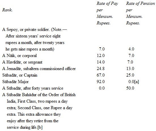 Every soldier is entitled to a pension when pronounced by a board of surgeons as no longer fit for the active duties of his profession, after fifteen years' active service; but to be entitled to the pension of his rank in the army, he must have served in such rank for three years. Till he has done so he is entitled only to the pension of that immediately below it. A sepoy gets four rupees a month, that is, about one-fourth more than the ordinary wages of common uninstructed labour throughout the country.1133 But it will be better to give the rate of pay of the native officers and men of our native infantry and that of their retired pensions in one table.