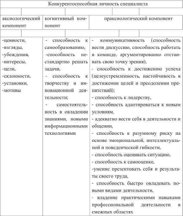 С точки зрения психологии и педагогики конкурентоспособная личность – это субъект социальных действий и изменений, способный осознать динамику процессов развития, видеть происходящие изменения и уметь реагировать на них в условиях изменчивого рынка.