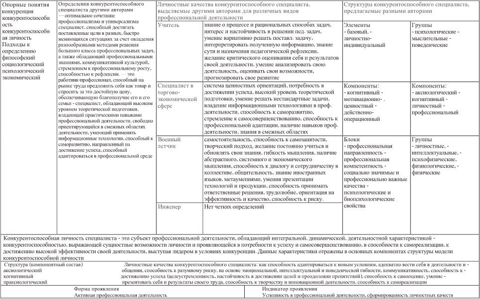 Это определение обобщает ранее данные и выделяет личностные качества конкурентоспособного специалиста, не зависящие от вида деятельности. Отметим, что конкурентоспособность как качество личности является внепрофессиональной и надпрофессиональной характеристикой, необходимой каждой личности.