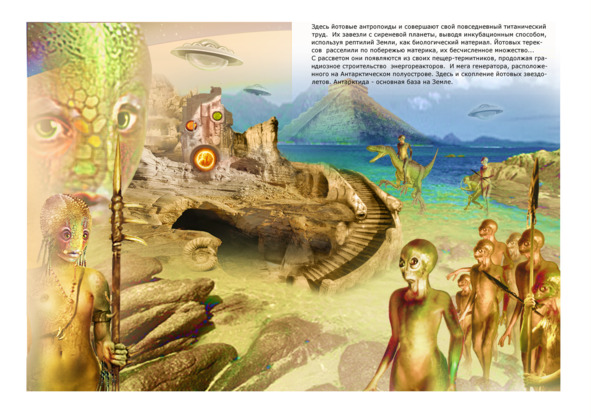 Их завезли с Сиреневой планеты, выводя генетически-инкубационным способом, используя рептилий Земли, как биологический материал. Йотовых терексов расселили по побережью материка, их бесчисленное множество… С рассветом они появляются из своих пещер-термитников и упорно продолжаяют огромное строительство энергореакторов. И, грандиозного по масштабам мега генератора, расположенного на антарктическом полуострове. Здесь и скопление множества йотовых звездолетов, постоянно парящих в воздухе и опускающихся на площадки.