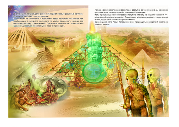 Эволюционируют йотовые земляне на одном материке-Антарктиде, не покрытой еще льдами. С островов Антарктики они и начнут свою миссионерскую миграцию по голубой планете. Йоты – рабочий материал планеты. А позже, совместно с землянами, часть её общественно-созидающего разума.