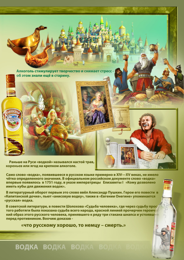 «Водка» по-русски – это уменьшительное, ласкательное слово от слова вода то есть «водичка» – равная искрящейся прозрачности горного ручья или родника, так назвал её народ. И это же название закрепили за ней ученые: за химическую чистоту, таинственность и простоту, равные простоте и таинственности воды.