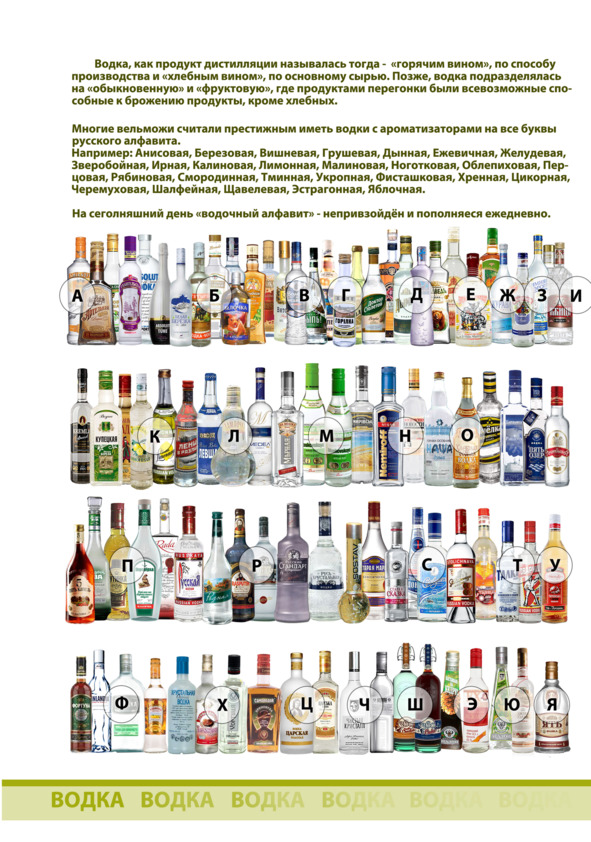 Водка, как продукт дистилляции называлась тогда – «горячим вином», по способу производства и «хлебным вином», по основному сырью. Позже, водка подразделялась на «обыкновенную» и «фруктовую», где продуктами перегонки были всевозможные способные к брожению продукты, кроме хлебных. Многие вельможи считали престижным иметь водки с ароматизаторами на все буквы русского алфавита.