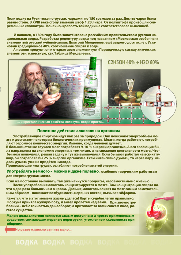 Разработал рецептуру водки под названием «Московская особенная» знаменитый русский учёный химик Дмитрий Менделеев, ещё задолго до этих лет. Установив традиционное 40% соотношение спирта к воде. А приняв с удовольствием сей продукт, он и открыл свою знаменитую «Периодическую систему химических элементов», известную, как Таблица Менделеева.