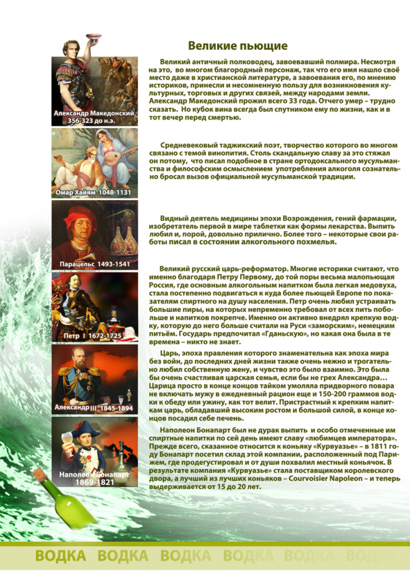 Великий русский царь-реформатор. Многие историки считают, что именно благодаря Петру Первому до той поры весьма мало пьющая Россия, где основным алкогольным напитком была легкая медовуха, стала постепенно подвигаться к куда более пьющей Европе по показателям спиртного на душу населения. Петр очень любил устраивать большие пиры, на которых непременно требовал от всех пить побольше и напитков покрепче. Именно он активно внедрял крепкую водку, которую до него больше считали на Руси «заморским», немецким питьём. Государь предпочитал «Гданьскую», но какая она была в те времена – никто не знает.