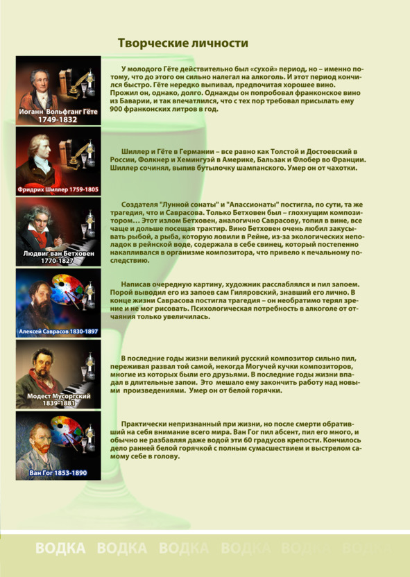 У молодого Гёте действительно был «сухой» период, но – именно потому, что до этого он сильно налегал на алкоголь. И этот период кончился быстро. Гёте нередко выпивал, предпочитая хорошее вино. Прожил он, однако, долго. Однажды он попробовал франконское вино из Баварии, и так впечатлился, что с тех пор требовал присылать ему 900 франконских литров в год.